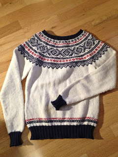 Scene 2. Onsdag kveld. Maratonstrikk. Strikker på meg gnagsår på pekefingeren. Og på lillefingeren. En arm klar. To armer klare. Genser klar.